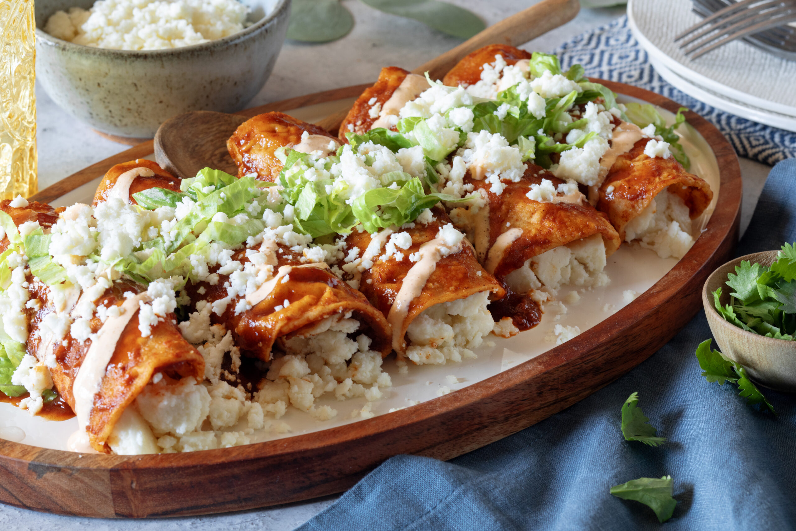 - Add crumbled Queso Fresco to the middle of the tortilla and top with a few slices of pepper (optional). Roll tortilla around the filling to make the enchilada. To serve, top enchiladas with lettuce, queso fresco crumbles, and drizzle with chipotle crema.