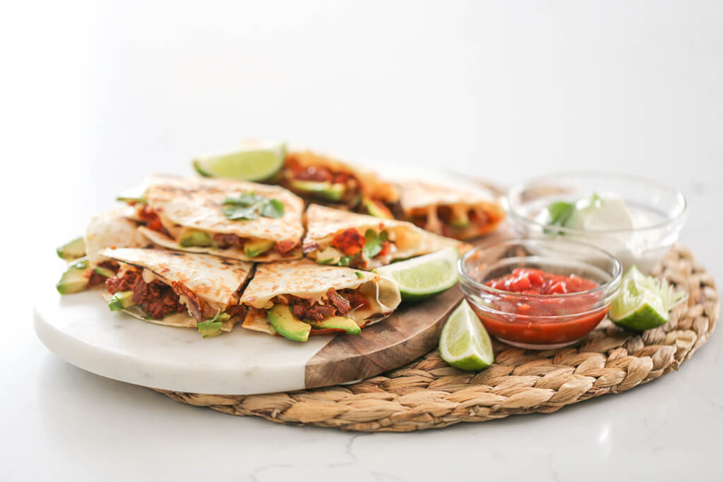 - Once chorizo is cooked, assemble quesadillas by placing a handful of shredded Oaxaca cheese on half of open flour tortilla, cover it with three tablespoons of cooked chorizo, top the cooked chorizo with sliced avocado (approximately half of one avocado per quesadilla depending on size), and then top with more shredded cheese. Fold top half of tortilla over the cheese and place into a skillet on medium low heat. Cook until cheese is melted and tortilla is browned. Remove from heat.