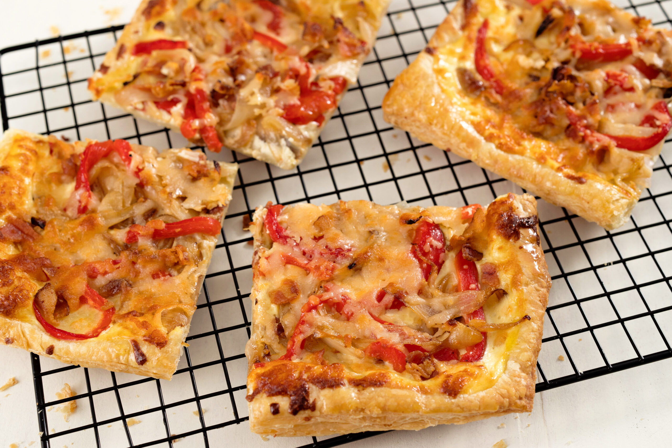 - Scatter the cooked bacon over the crema. Top with the red pepper strips, and then spoon the onions evenly over all. Scatter with the Queso Quesadilla, and bake for 25 to 30 minutes, until the pastry puffs up around the edges and turns golden. Serve warm or at room temperature.