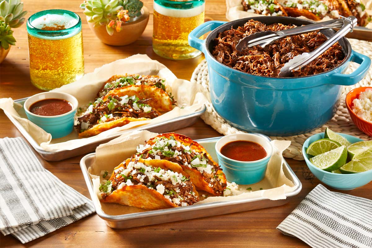 - Place the Dutch oven pot with the beef back on the stove at medium heat. Pour the contents of the blender over the beef, you can add more beef broth if the sauce does not cover the beef. Bring to a simmer, then cover and lower heat. Simmer until meat is tender for about 2.5 hours. Turn off heat, remove beef from the sauce, and shred meat with forks. Reserve the sauce for serving.
