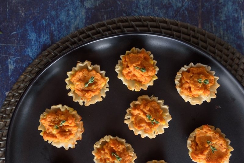- Spray a baking sheet lightly with olive oil. Spread phyllo cups out on prepared baking sheet. Fill each phyllo cup with a spoonful of pumpkin-cotija filling. Each cup should be completely full. Bake for 10 minutes, or until the phyllo dough is a light golden color. If desired, garnish each pumpkin puff with a sprig of thyme.