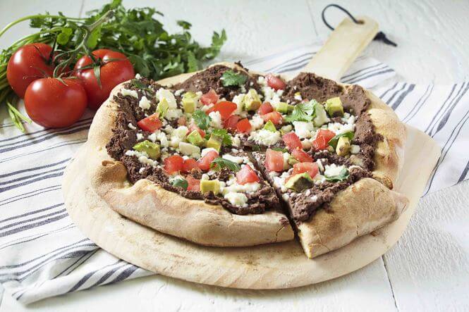 - In a food processor or blender, puree black beans, olive oil, chili powder, cumin, and salt until smooth. Spread the puree evenly onto the pizza dough and bake until the crust is golden, about 15 minutes.