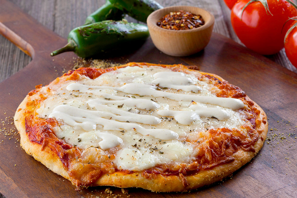 - Spread tomato paste over pizza dough, spread Cacique® Four Quesos and place pizza dough in a pre-heated oven at 400ºF for 15-20 minutes or until just lightly browned.