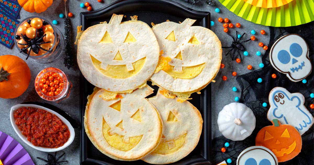 - Spread about a cup of the shredded Cacique® Queso Quesadilla on each tortilla. Top each one with the jack-o-lantern face tortillas.