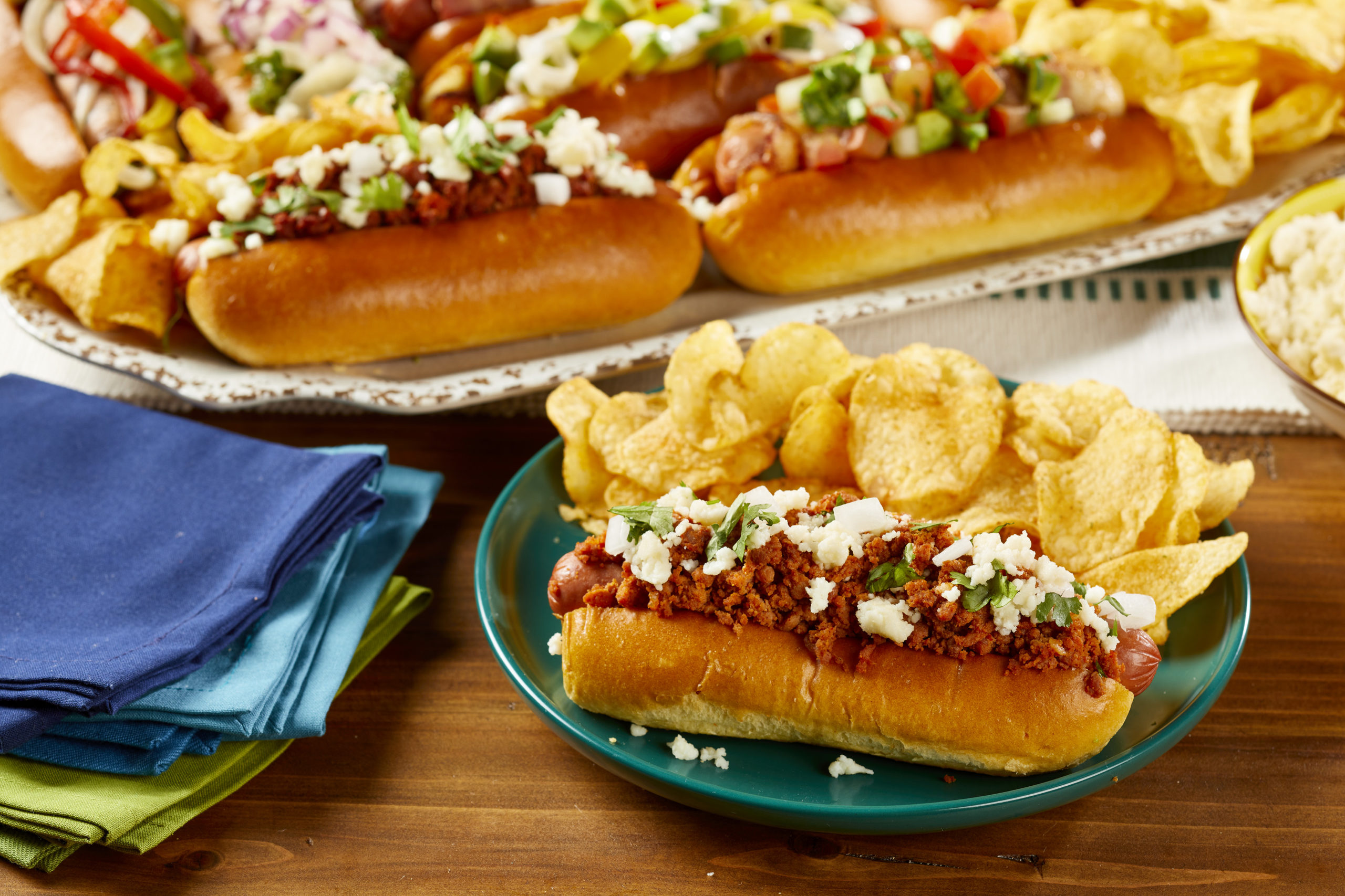 - Assemble the hot dogs by adding large spoonfuls of chorizo on top of each hot dog, top with onion, crumbled Queso Fresco and chopped cilantro.