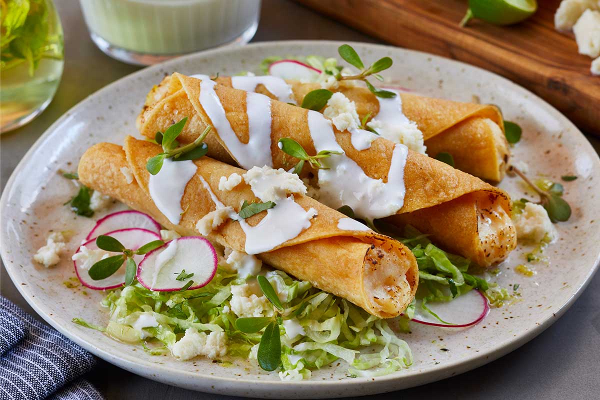 - Place filling in piping bag, and add 4 oz. of filling per tortilla. Once filled, roll and secure with toothpick. Heat vegetable oil and fry each taquito until golden brown, then drain on paper. To serve, dress salad and add to each plate. Divide up the taquitos and lay on top of salad. Garnish with Cacique Queso Fresco and a drizzle of Cacique Crema Mexicana Agria.