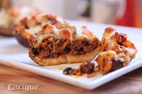 - Spoon mixture into the center of each hollowed out Portobello mushroom. Top each mushroom with 2 tablespoons of Cacique’s Four Queso Blend. Bake for 25 minutes. Remove from oven and allow to cool for 5 minute. Serve with salad or rice.
