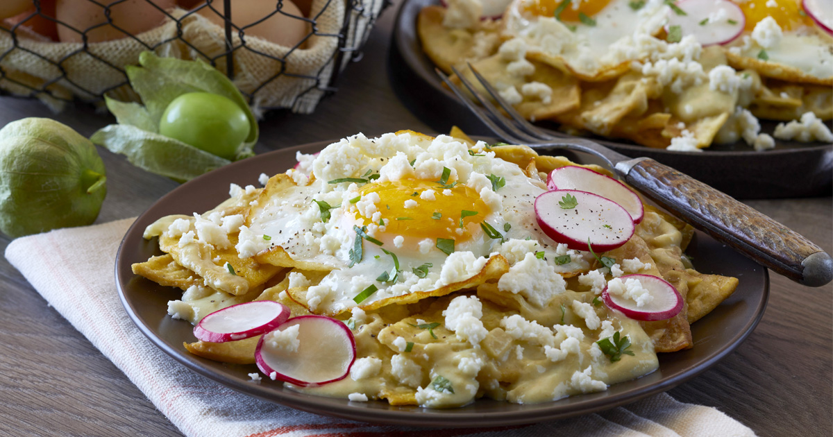 - Separately, warm the remaining 2 tablespoons olive oil in a large nonstick pan over medium-high heat. Fry the eggs (in batches, if you need to) for about 3 minutes, until the whites are set; flip and cook for just 5 or 10 seconds so the yolk stays runny. Serve the eggs on top of the chilaquiles, sprinkled with queso fresco, cilantro, and radishes. Serve immediately.