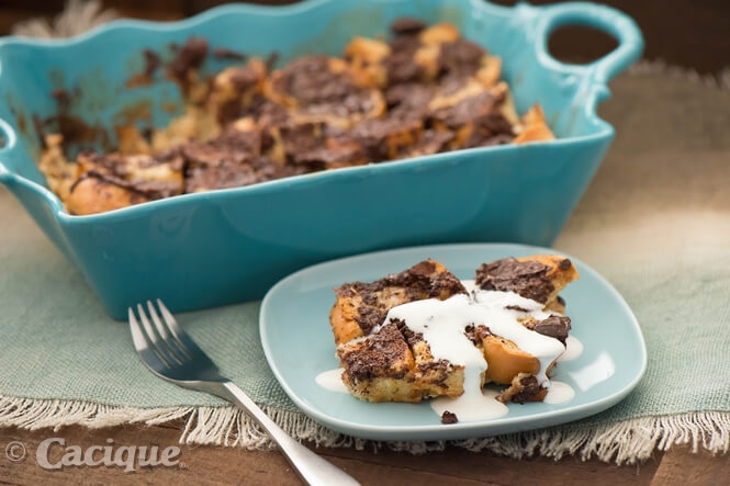 - Arrange half the bread pieces as a single layer in a 9x13 oven safe dish. Sprinkle half the chocolate over first bread layer. Repeat with second layer, sprinkling remaining chocolate. Pour custard over bread, pressing bread gently to make sure custard is soaked up.