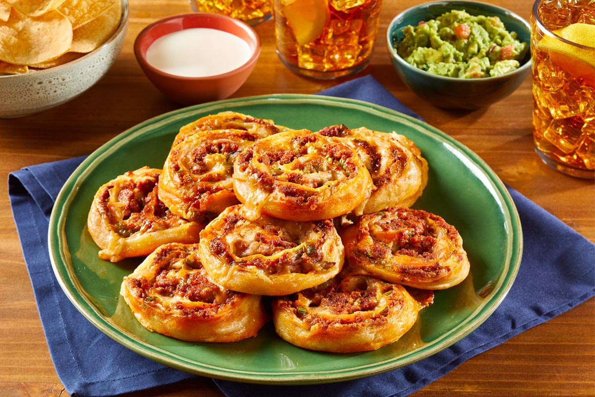 - Sprinkle a small amount of flour on a countertop or cutting board. Unroll 1 crescent roll sheet onto the work surface, and press into a 12x8-inch rectangle, pressing seams together. Sprinkle half of the shredded Oaxaca cheese evenly over the dough, leaving a 1/2-inch border on each of the short ends. Sprinkle with 1/2 of the cooked chorizo, 1/2 of the green chiles, and 1/2 of the green onions. Starting at the long edge, roll dough up into a log, pinching short ends to seal and keep the filling in. Wrap log in plastic wrap or parchment paper.