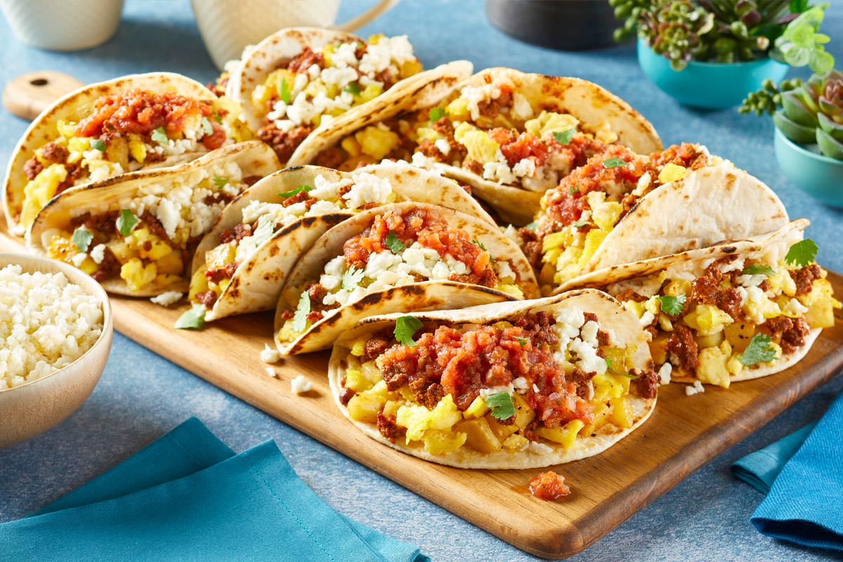 - To assemble the tacos. Fill with roasted potatoes and the chorizo-egg mixture, taking care not to overstuff. Garnish with a heaping spoonful of crumbled Cacique Panela®, as well as Cacique Homestyle Salsa and fresh cilantro (if desired).