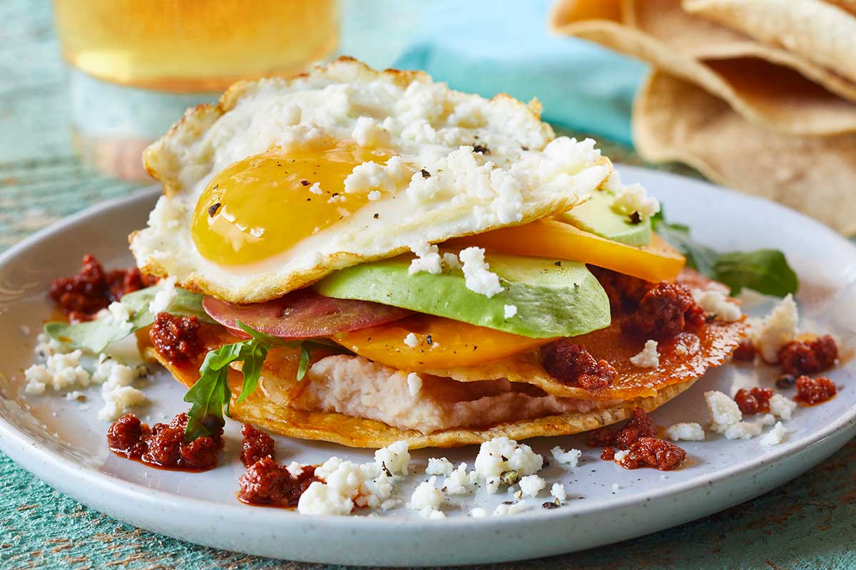 - If your range doesn’t have a griddle, use a flattop attachment or a large electric skillet on low heat to warm your tlayuda tortilla, but only begin this process once all ingredients are ready to go. Meanwhile, warm the beans in a saucepan over low heat. Using a spatula, apply a thin layer of chorizo oil to cover the tlayuda while it’s on the griddle. Add 2 tablespoons of refried beans, leaving a thin strip of the tortilla’s circumference exposed. Add the Cacique Oaxaca to a plancha over medium low heat and over a drizzle of vegetable oil for about 1-2 minutes, until the top later melts and the plancha side gets a crispy skin. Quickly peel off the melted cheese with a spackling knife and place it melted side down on the tlayuda. At the same time, fry one egg in oil briefly to achieve a runny yolk, then add salt and pepper to taste, and remove from the heat. Add the crumbled Cacique Queso Fresco over the mini tlayuda, and place the tomato and avocado slices on top. Spoon over the chorizo, apply the arugula, and place the fried egg on top. This should all be done quickly, monitoring the tlayuda so it doesn’t burn. You can remove it from the heat and place in on a cutting board to do some assembly if it gets too hot, but the object is to layer the tlayuda rapidly. Serve with salsa on the side.