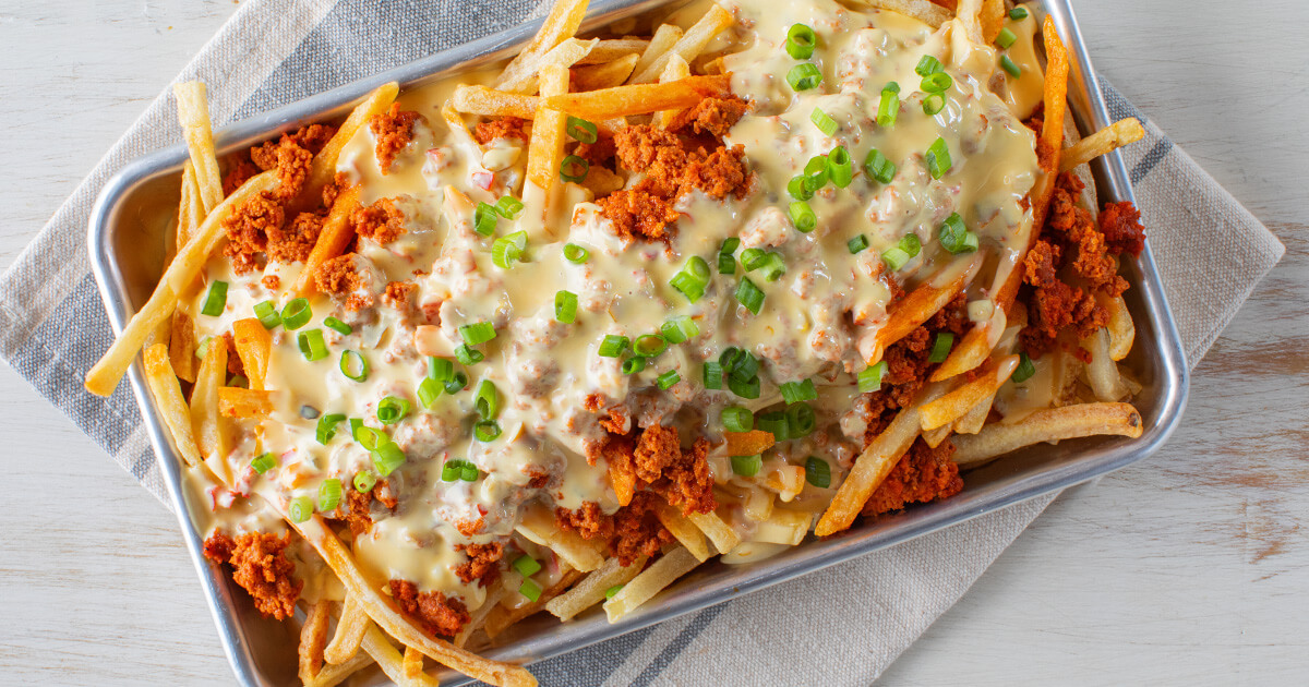 - Push the cooked French fries towards the middle of the baking tray and crumble on the chorizo, pour on the Southwestern Queso Dip and finish with the chopped green onion.