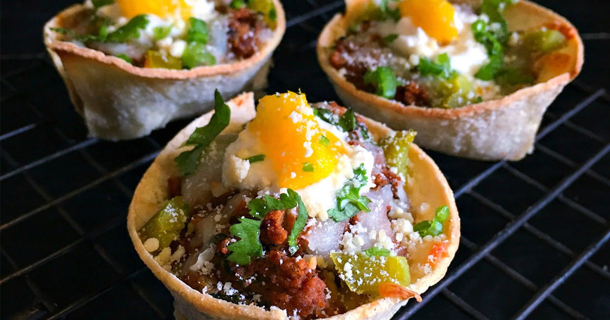 - Take a muffin tin and place 2 slices of quartered corn tortilla over each other to form a cup shape. Add 1.5 tablespoon of mixture in each corn cup. Sprinkle with Oaxaca cheese and bake for 15 minutes.