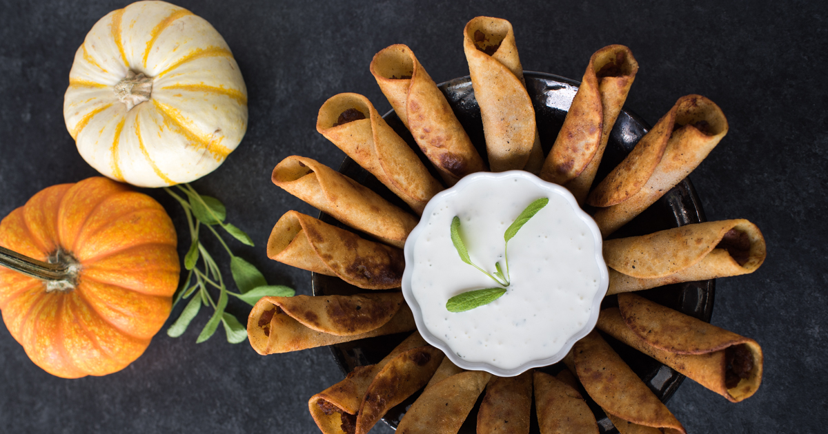CHORIZO PUMPKIN TAQUITOS WITH SAGE CREMA