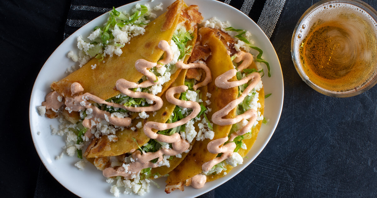 - To serve, combine the Cacique® Crema Mexicana with the hot sauce or minced chipotle. Drizzle this over the tacos and top with shredded cabbage and the remaining Cacique® Ranchero Queso Fresco. Serve with wedges of lime.