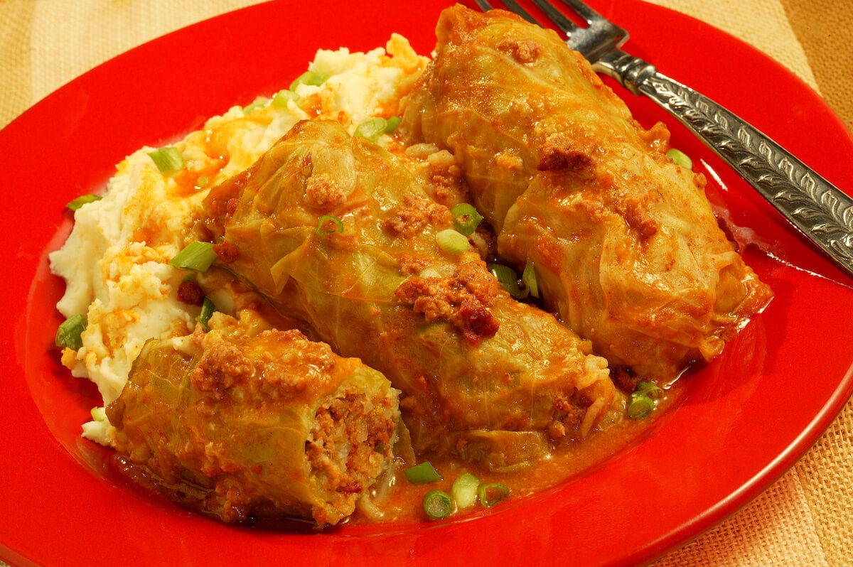 - Roll 1-2 tablepoons meat and egg mixture in each leaf. Roll and layer in roasting pan. Sprinkle flour over rolls, and add paprika if desired.