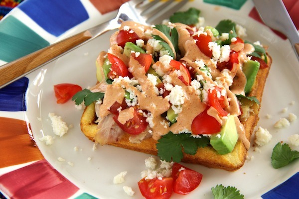 Cornbread Waffles with Chicken, Avocado, and Sweet & Spicy Crema