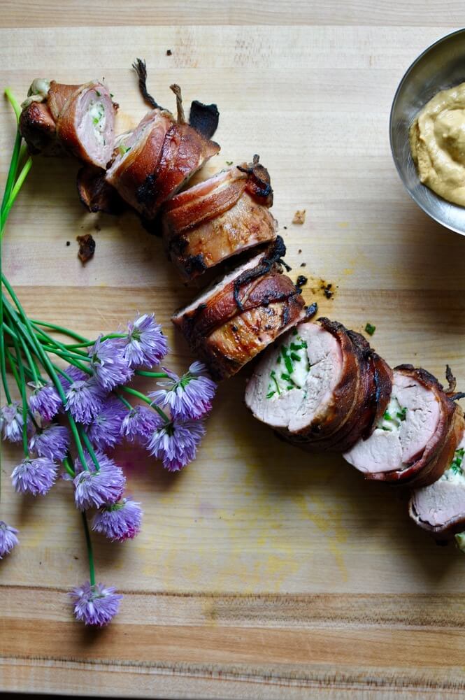 - In a medium bowl, combine both cheeses, chives, salt, and pepper. Place cheese mixture down the middle of the tenderloin, then lift one side of the tenderloin over to cover the cheese. Continue rolling the tenderloin until it is completely rolled up.