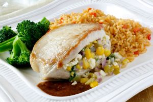 - In a small bowl mix together chiles, corn, cilantro, onion, and Cacique® Cotija. Stuff mixture into each pork chop pocket. Place in prepared baking dish and bake for 20-25 minutes, or until pork is cooked though and filling is hot.