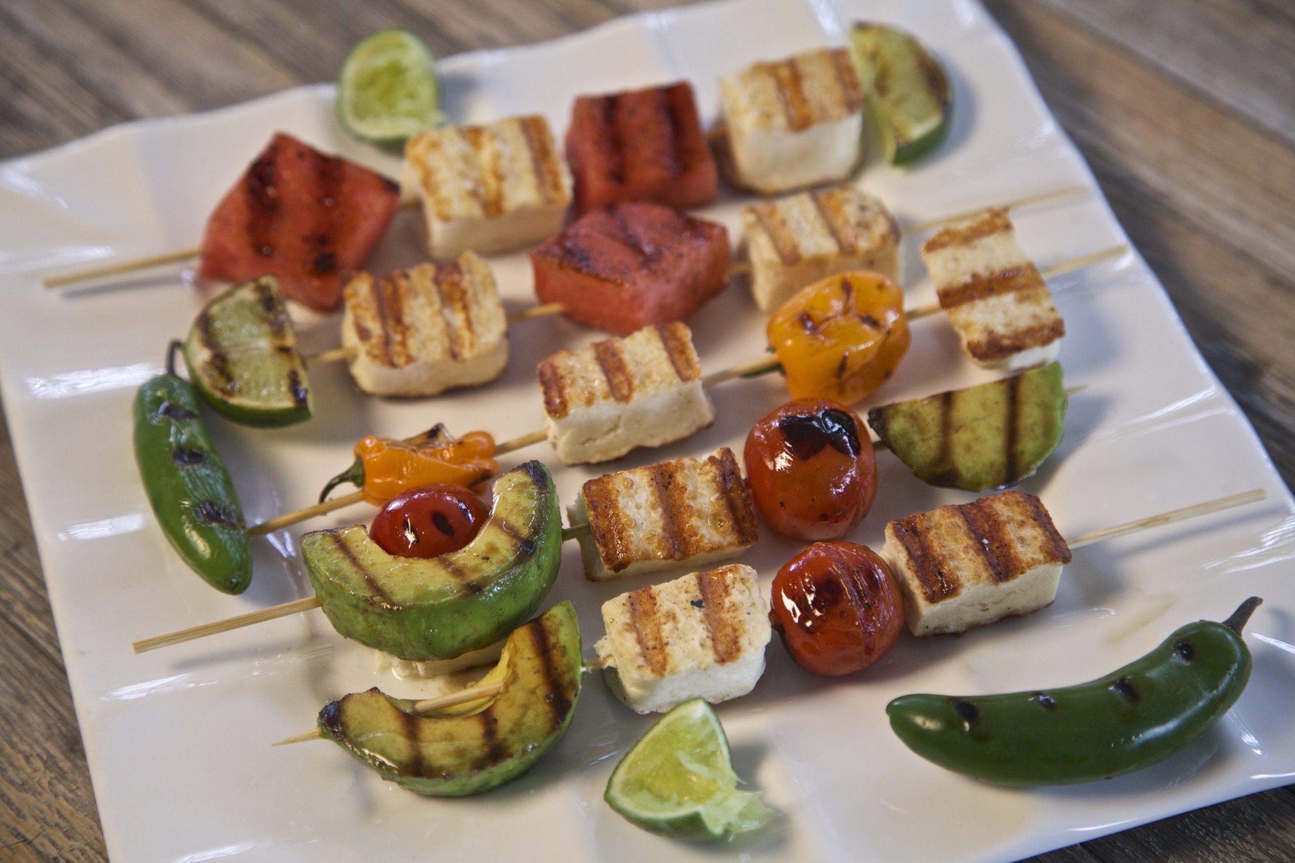 - Lightly brush grill with olive oil. Heat grill. Place cotija-bobs on grill and allow to cook on each side for 5 minutes or until golden crisp. Remove from grill and allow to cool for 2 minutes. Squeeze lime all over entire platter of kabobs.