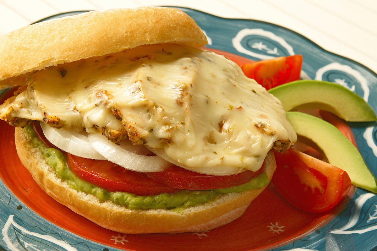 - To Assemble: On bottom half of bread, spread guacamole, tomato slices and onion. Next add chicken slices. Top each with 1/4 cup shredded Queso Quesadilla. Cover with top half of bread and place in a 375ºF oven for 10 minutes or grill on panini grill. These sandwiches can be wrapped in aluminum foil for a picnic or BBQ. Simply reheat by placing foil wrapped sandwiches right on grill.