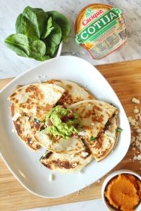 - Spread pumpkin puree on top of 2 of the tortillas. In a medium-sized pan, saute spinach and mushrooms in olive oil. Add spinach and mushroom mixture on top of the pumpkin. Sprinkle with Cacique Cotija cheese, crushed red pepper flakes, salt and pepper. Top with remaining tortillas.