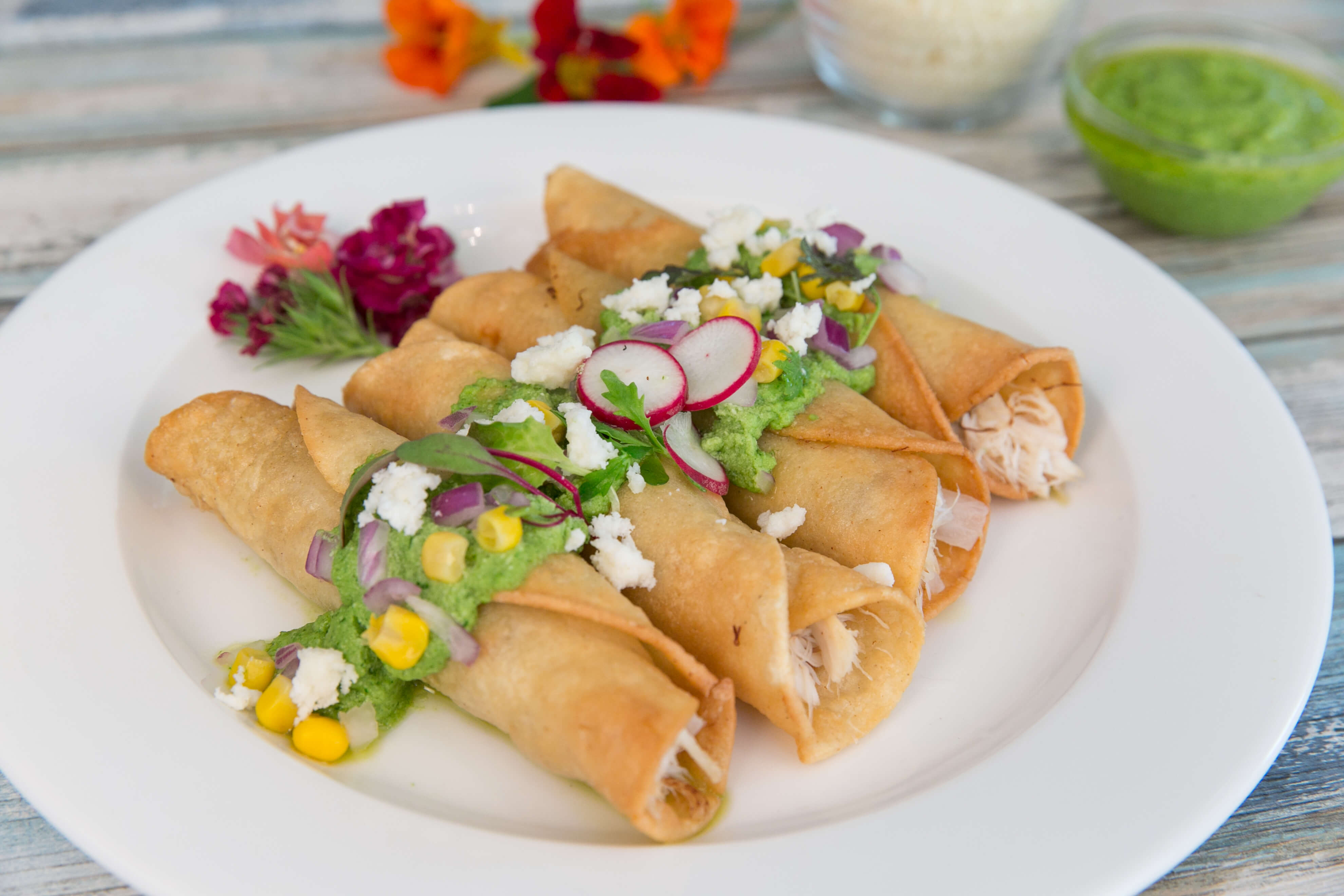 - Drizzle the crab flautas with Cacique Cilantro Lime Sour Cream. On top, add the escabeche corn, diced red onion and Cacique Cotija Cheese. Garnish with the frisee lettuce, sliced radishes and micro cilantro.