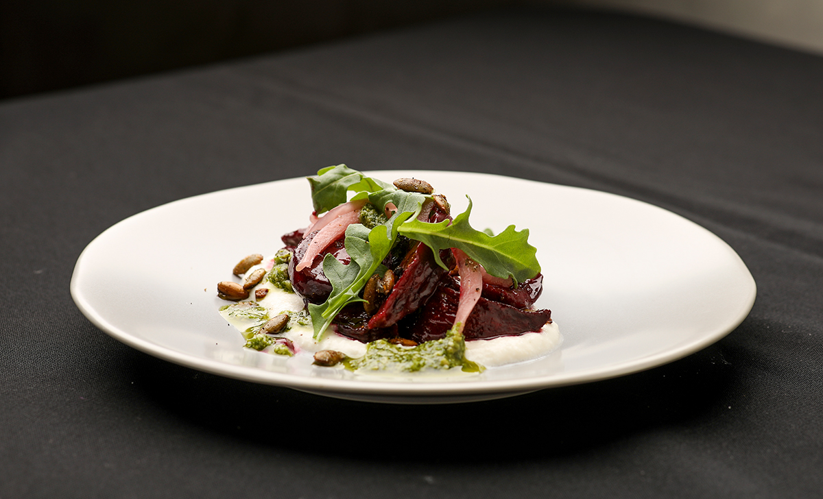 - In a separate bowl, toss the arugula, cilantro, sliced radishes and pickled onions with 2 tablespoons of the vinaigrette and place on top of the beets. Finish with the toasted pumpkin seeds.