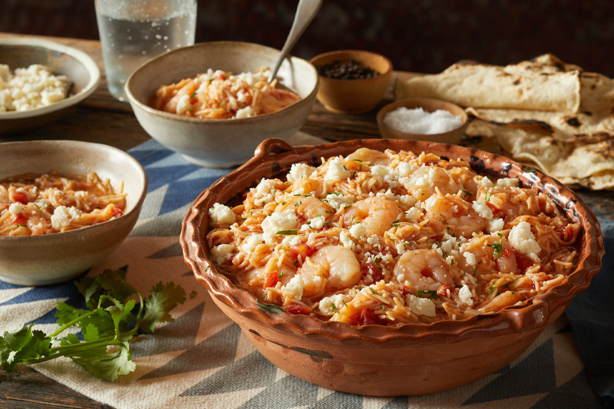Fideos with Shrimp and Cacique® Queso Fresco