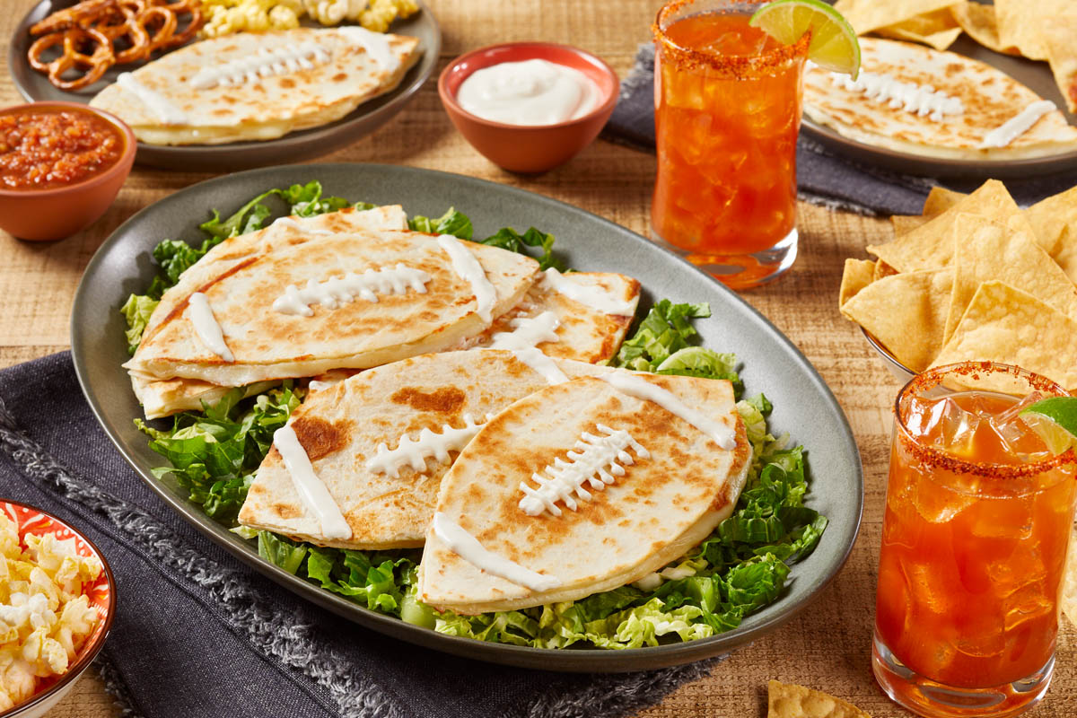 - Cut quesadillas into football shape. Create the football laces with Cacique® Original Squeeze Cream and serve with your favorite salsa.