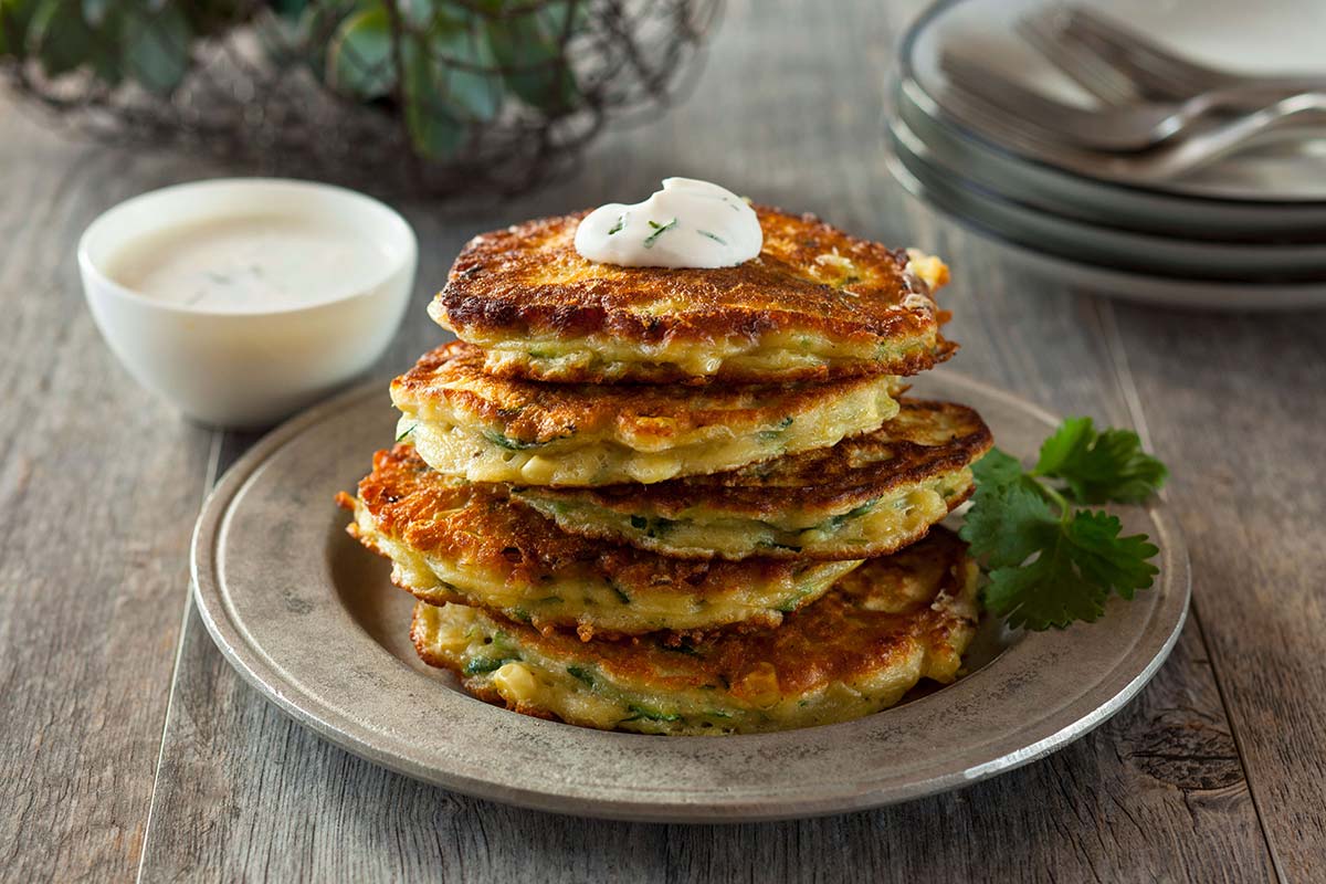 Fresh Corn, Jalapeno & Zucchini Cakes with Crema, Lime and Cilantro Dressing