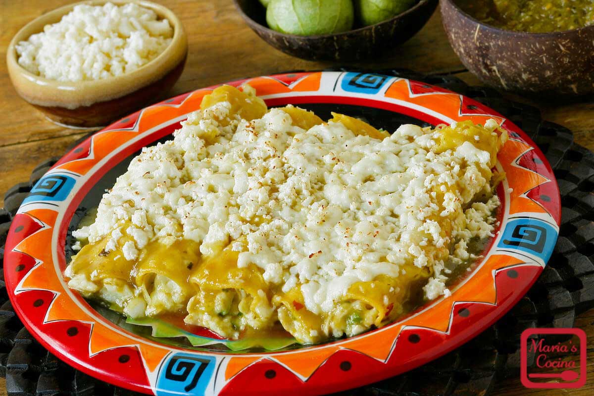 - Cover enchiladas with remaining sauce and bake for 15 - 20 minutes. Top with remaining cheeses and bake for 5-7 minutes or until cheese starts to brown. Remove from oven and drizzle with Cacique® Crema Mexicana. Garnish with cilantro and serve hot.