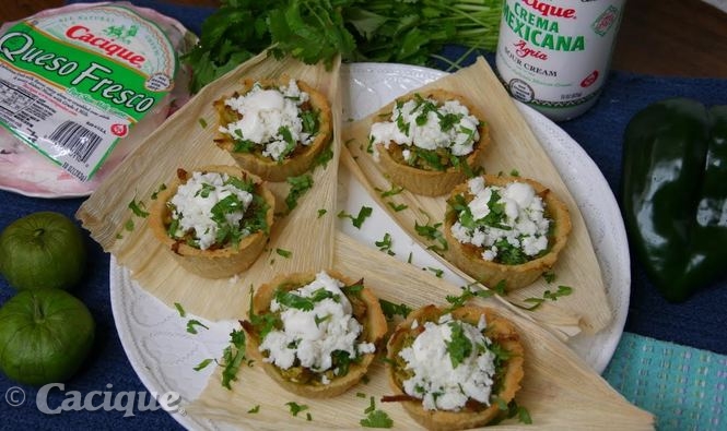 - To assemble: Remove the plastic wrap from the bowl of masa. Divide the masa evenly among the wells of a 12-well muffin pan. Using your fingers, press the masa evenly into a thin layer on the bottom and up the sides of each well. Fill each cupcake with the chicken filling. Bake for 35 minutes until the masa crust is golden brown. Remove the pan to a wire rack and let it cool for 5 minutes. Remove the cupcakes. Top each tamale cupcake with Cacique® Queso Fresco, Cacique® Crema Mexicana Agria and fresh chopped cilantro. Serve warm.