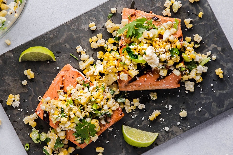 - Preheat a grill or grill pan until it’s very hot. Pat the salmon with a paper towel until it is very dry, then season with salt and pepper. Use a pastry brush (or a paper towel that you hold with kitchen tongs) to brush the grill grates with canola oil. Place the salmon skin-side up on the hot grill and let cook for 3-4 minutes per side. When it’s ready to flip, the fish should lift easily off the grill with a spatula. Top with corn salsa, Cilantro Lime Sour Cream, sprinkle with some extra cilantro and cotija, and serve.