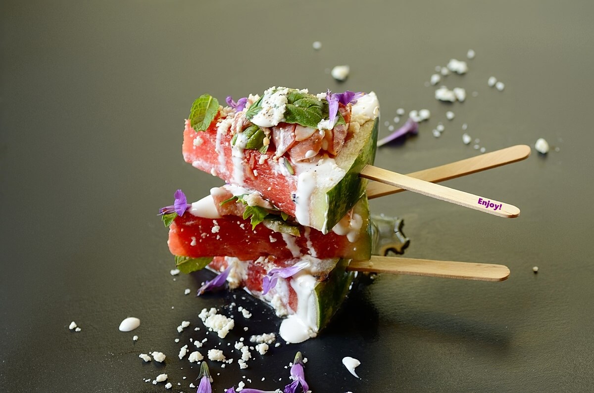 - Top with salami and basil leaves, drizzle with Cacique® Crema Mexicana and sprinkle on the Cacique® Queso Cotija. Cut watermelon into 8 slices. Cut a small opening in the rind by piercing with the tip of a pairing knife and insert a Popsicle stick. Serve and enjoy!