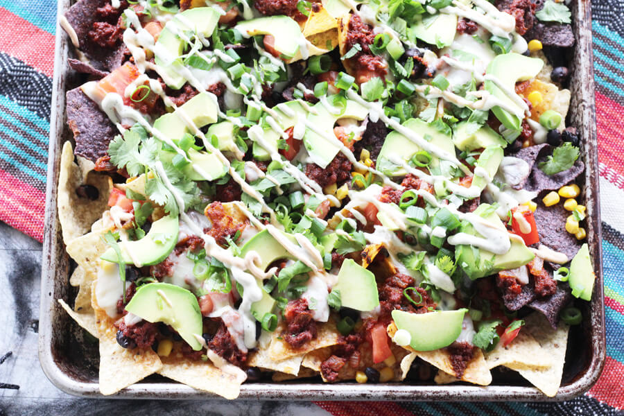 - Preheat oven to 375. Arrange tortilla chips on a large rimmed baking sheet. Top evenly with black beans, corn, and tomato. Set aside.