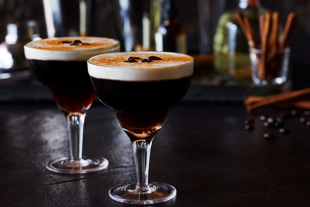 - Build the drink by mixing the coffee liqueur, tequila and chilled black coffee in a coupe glass. Add a thin layer of cream on top. Garnish with cinnamon dust and 3 coffee beans.