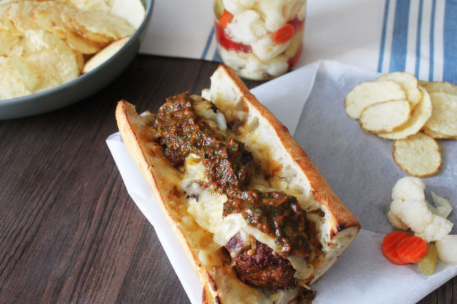 Mexican Meatball Sandwich with Roasted Tomato & Pepper Chimichurri Sauce