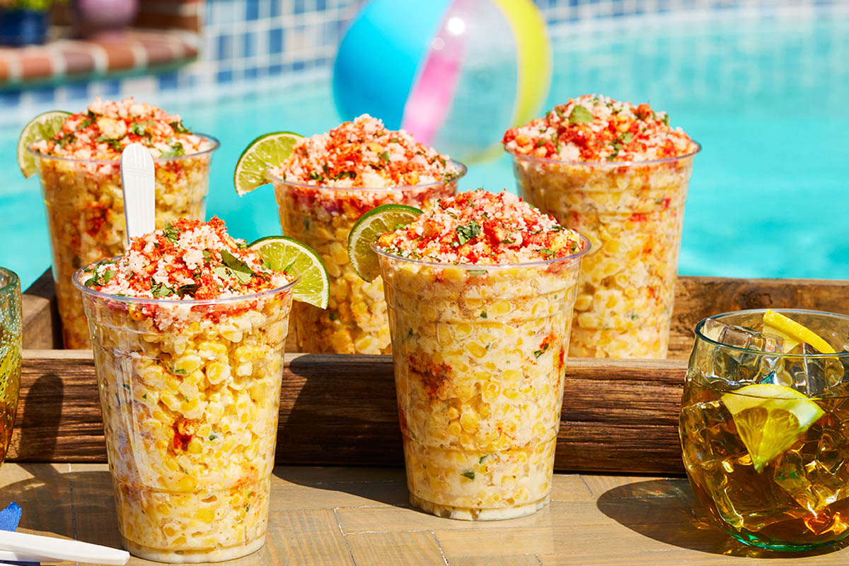 - To build your elote cups, add 1-2 spoonfuls of corn mixture to the bottoms of your cups. Then sprinkle on some chili powder and Tajin. Repeat layers until you nearly fill your cups. Leave some room for toppings.