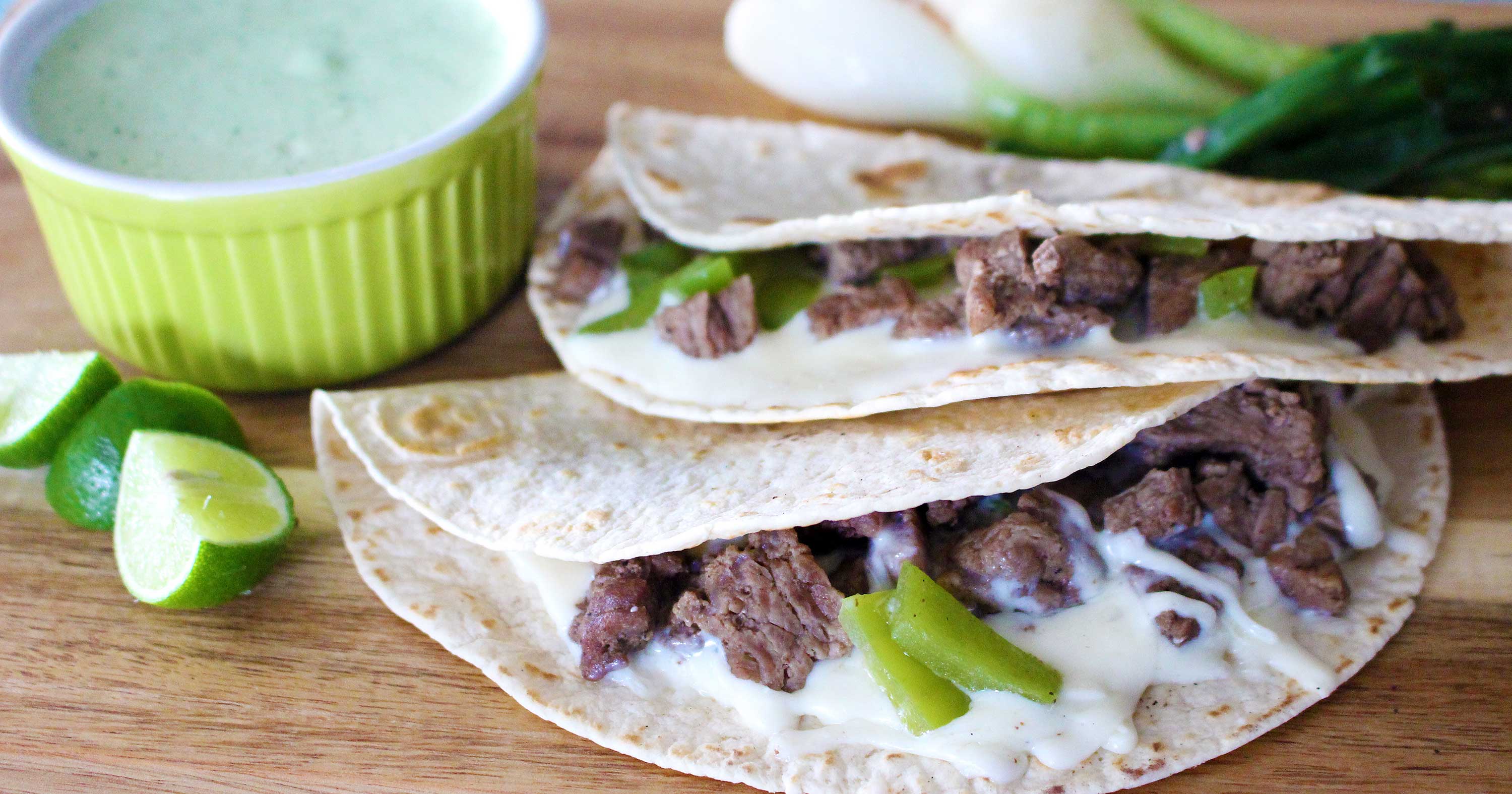 - Once the meat is cooked, heat another skillet or comal. Heat your tortillas on each side and add cheese to one side. Then add a scoop of meat and fold tortilla. Serve with salsa and green onions on the side.