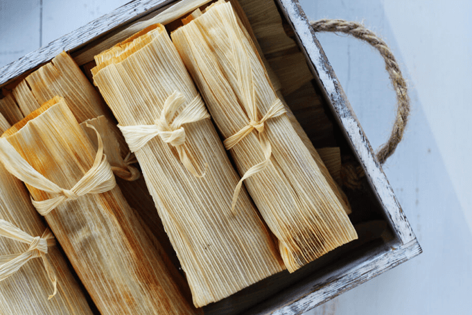 - Corn Husks: Remove the dried corn husks from package. Place in a large bowl and cover with hot water. Weight the corn husks down with a heavy bowl to keep them submerged. Soak for at least one hour before starting. When ready to assemble the tamales, drain all of the water and stand the husks up in the bowl.