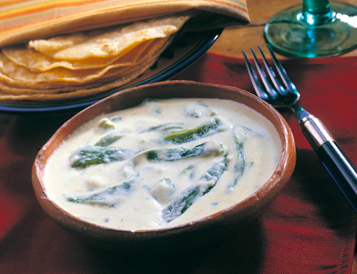 - Saute onion, chile strips, and garlic in oil until soft. Add cilantro, Crema Mexicana and cheese. Heat slowly over low flame. Serve with corn or flour tortillas.