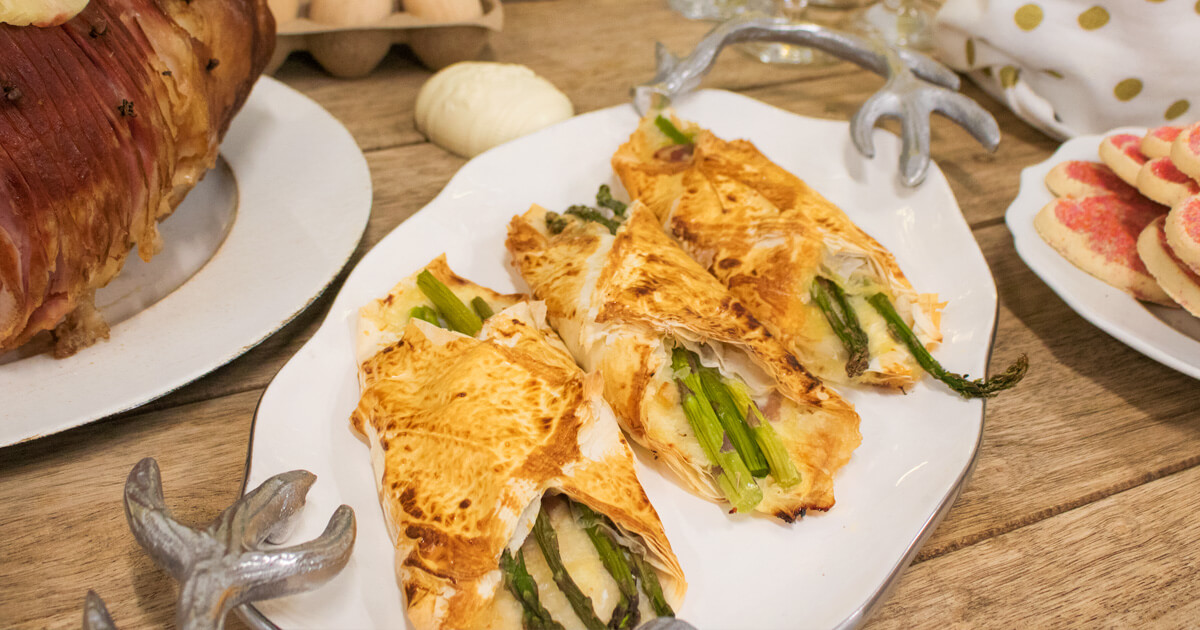 - Wrap the pancetta around the asparagus, then wrap the puff pastry. Make sure the puff pastry is overlapping and press down a little bit to ensure it sticks. Brush the puff pastry with some more egg wash, pop on the baking sheet and bake for about 15 minutes, or until golden and puffed. Serve immediately.