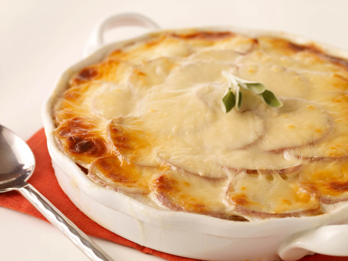 - Thinly slice potatoes and place one-third on the bottom of a pie plate. Pour one-third of the milk over top. Sprinkle lightly with salt and pepper. Top with a little Cacique® Queso Quesadilla and thyme (or herb of choice). Repeat until all ingredients are used.