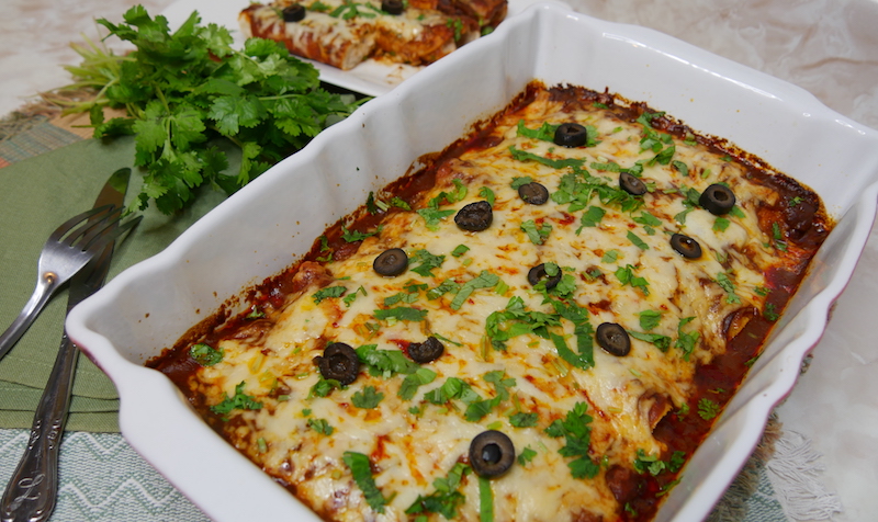 - Bake for 30 minutes until enchiladas are heated well through and the cheese has melted. Sprinkle with cilantro and black olives. Enjoy!