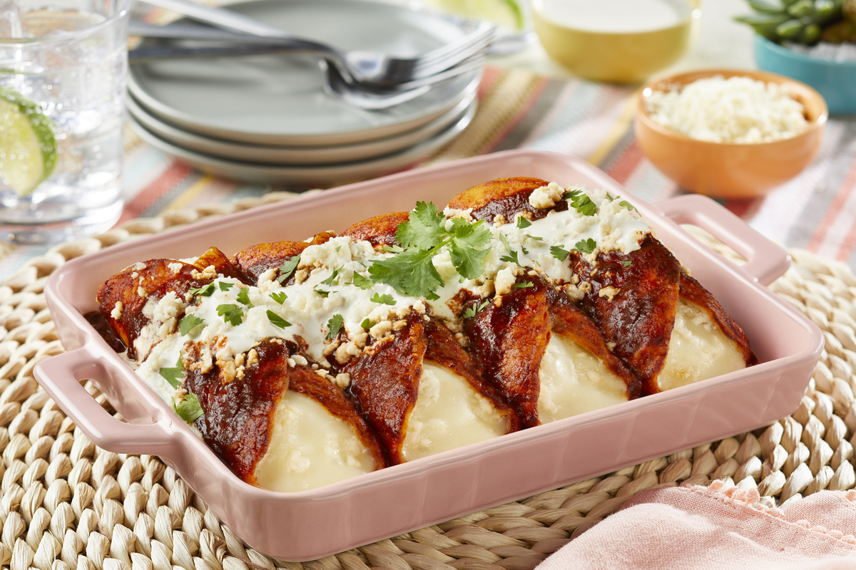 - FOR THE ENCHILADAS: Preheat oven to 350°F. Reserve ½ cup of Queso Fresco for garnish. Combine the Oaxaca and remaining Queso Fresco to use as filling. Enchilada Recipe: Bring the enchilada sauce to a boil in a medium saucepan over lower heat. Reserve ½ a cup of sauce to cover at the end. Dip each tortilla, one at a time, in sauce until soft (about 10 seconds) and carefully place each tortilla onto a baking sheet. Spoon cheese mixture onto the tortilla. Roll and arrange enchilada seam down in pan. Repeat with each tortilla. Cover enchiladas with remaining sauce and bake for 15 - 20 minutes or until cheese is melted. Top with reserved cheese mixture and Crema Mexicana. Serve hot.
