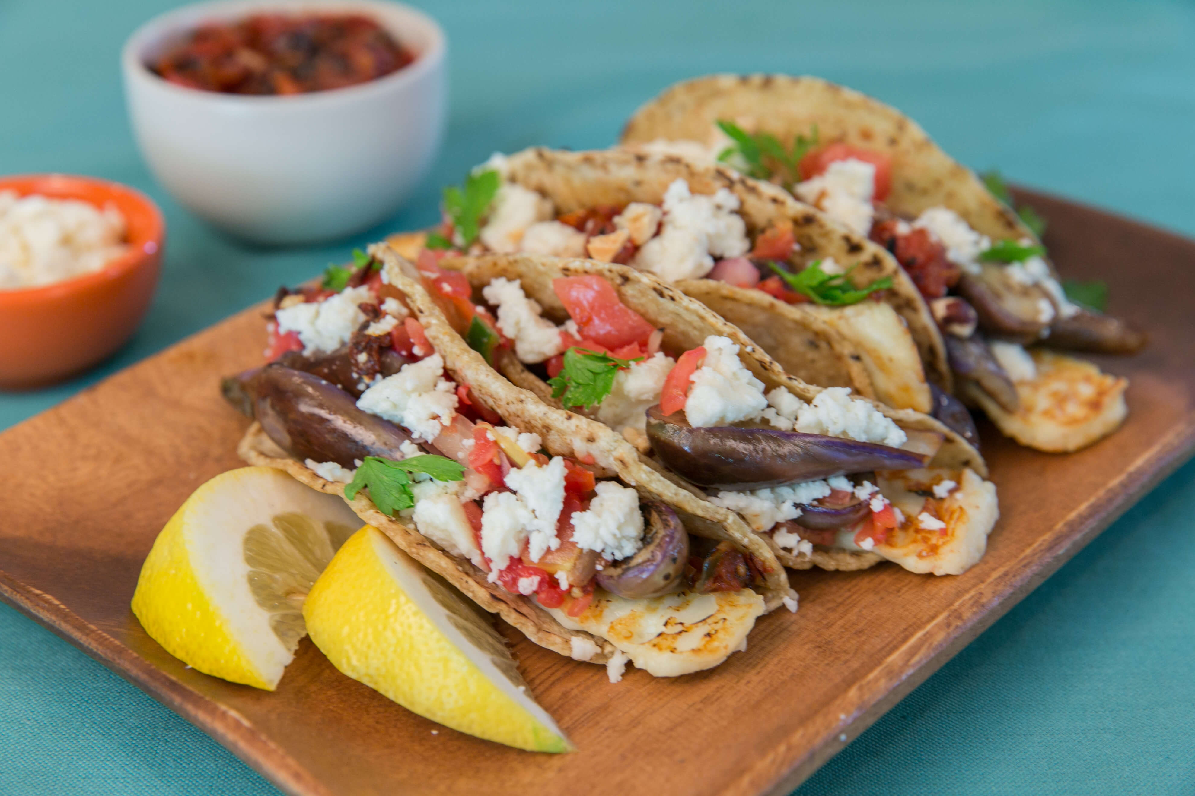 - For the Eggplant Tacos: Preheat oven to 375º F. Remove stems from eggplants and cut in half lengthwise. Season with salt generously and let stand, cut side up, for 10 minutes until the bitterness goes away. Wipe off moisture with a paper towel.