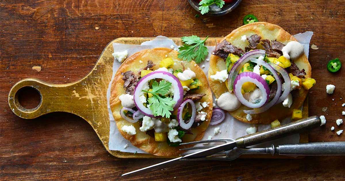 - To assemble, top each tostada with shredded meat, pineapple salsa, a sprinkle of Cotija, a dollop of Picante Sour Cream, and a few slices of red onion. Serve.