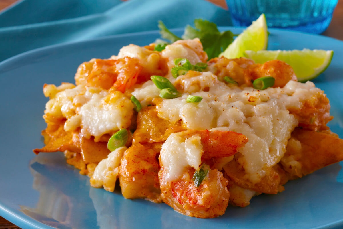 - Layer half of the the fried tortilla strips in the bottom of the prepared casserole. Pour half the seafood mixture over it, and repeat with remaining tortilla strips and seafood. Sprinkle with the Queso Fresco. Put in the oven and bake just until the sauce is bubbling, about 15 minutes. Serve at once.